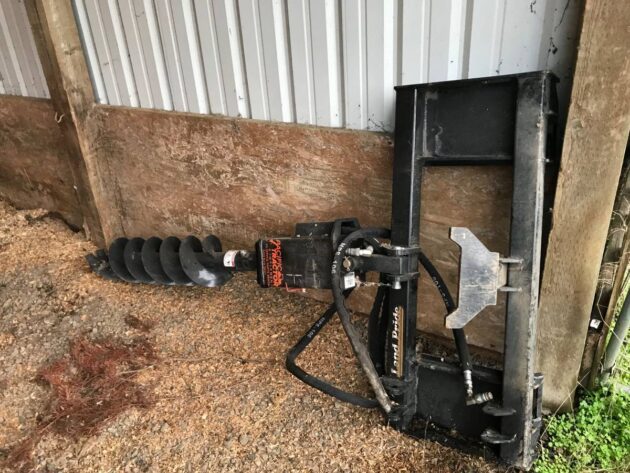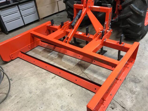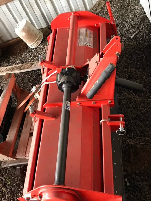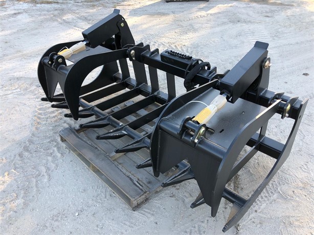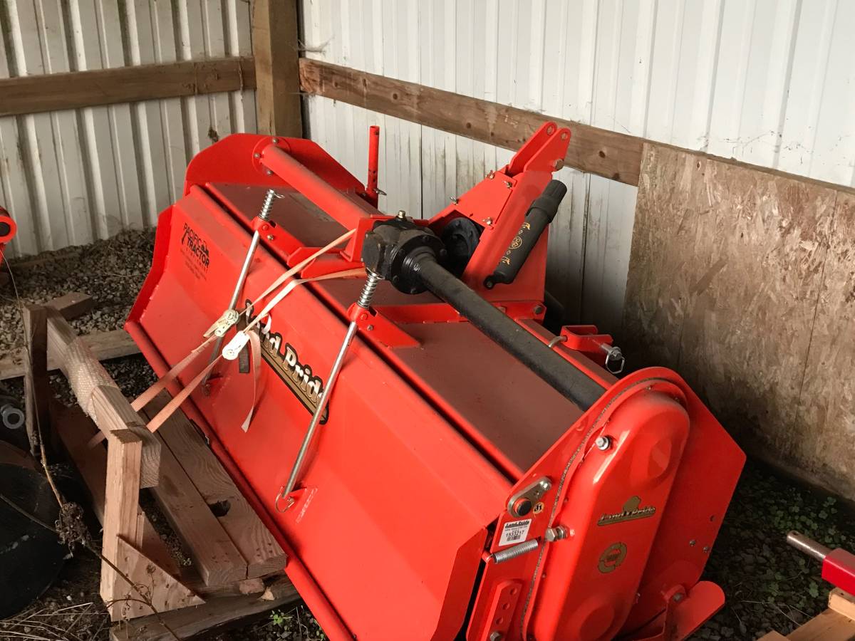 The tractor also includes the following seven attachments: Tiller, Grapple, Backhoe With Thumb, Log Splitter, Box Blade, Post Hole Digger, Brush Hog.