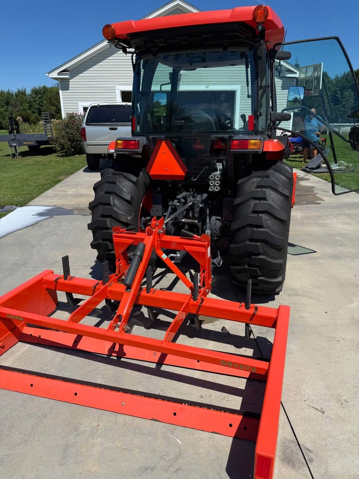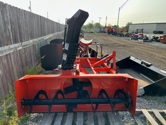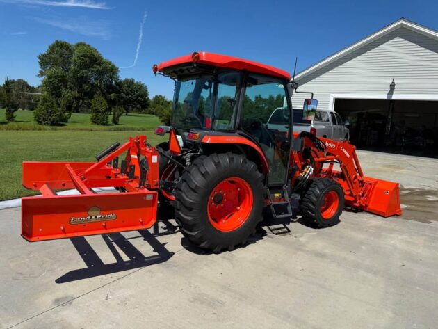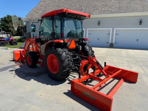 The tractor also includes the following six attachments: Kubota BH92 9 ft Backhoe with Hydraulic Thumb, Land Pride RCR1272 72″ Rotary Cutter, 64″ Width 2-Stage Snow Blower, Land Pride 72” Grading Scraper.